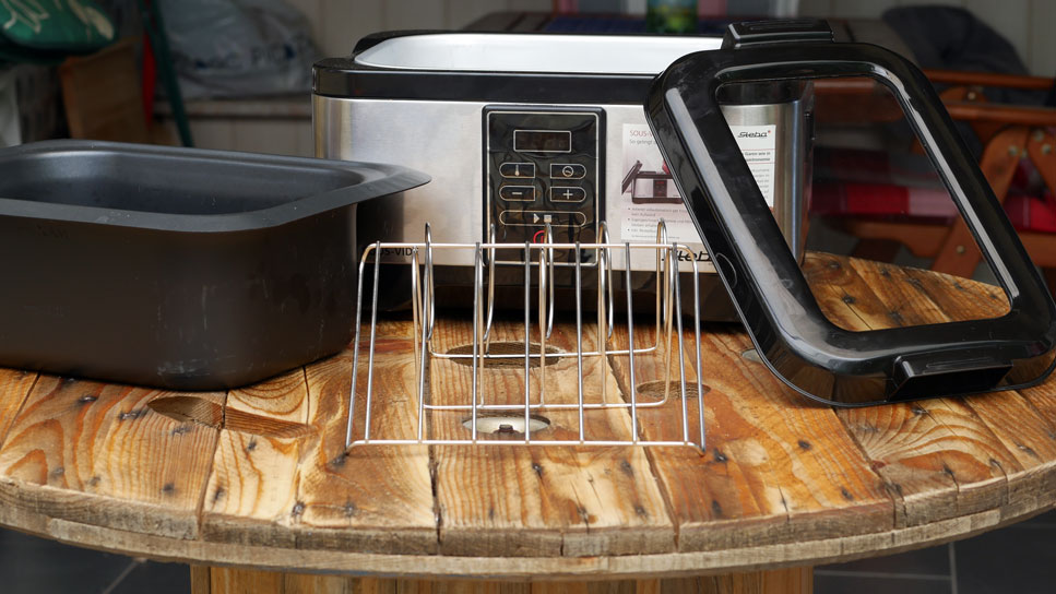 Mit dem Kauf des SousVide SV1 von Steba (Link zu Amazon) haben wir uns für Sous Vide Garer der unteren Preisklasse entschieden. Ich möchte nicht meinem Fazit vorgreifen, aber wir sind bisher sehr zufrieden. Das Gerät besteht aus folgenden Einzelteilen: