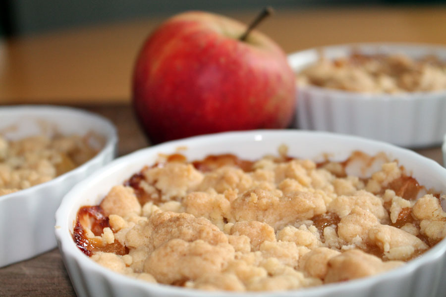 Den Backofen auf 200 Grad vorheizen. Die Streusel gleichmäßig auf die Äpfel in den Förmchen verteilen und im vorgeheizten Backofen solange backen bis die Streusel goldbraun sind.