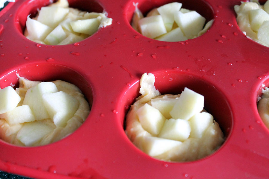 In jede Muffinform ein wenig Teig geben. Dann so viel Apfelstücke wie möglich darauf geben und wieder mit Teig bedecken.