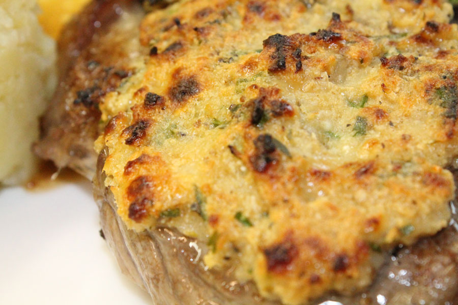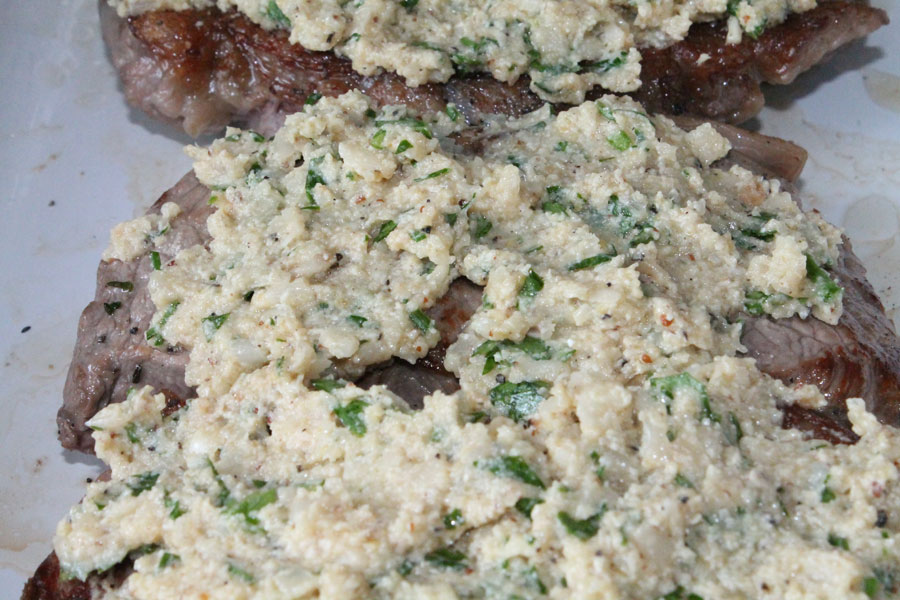 Die Steaks mit der Senf-Masse bestreichen und unter dem Grill im Backofen ca. 2 Minuten überbacken bis die Oberfläche der Kruste leicht bräunlich wird.