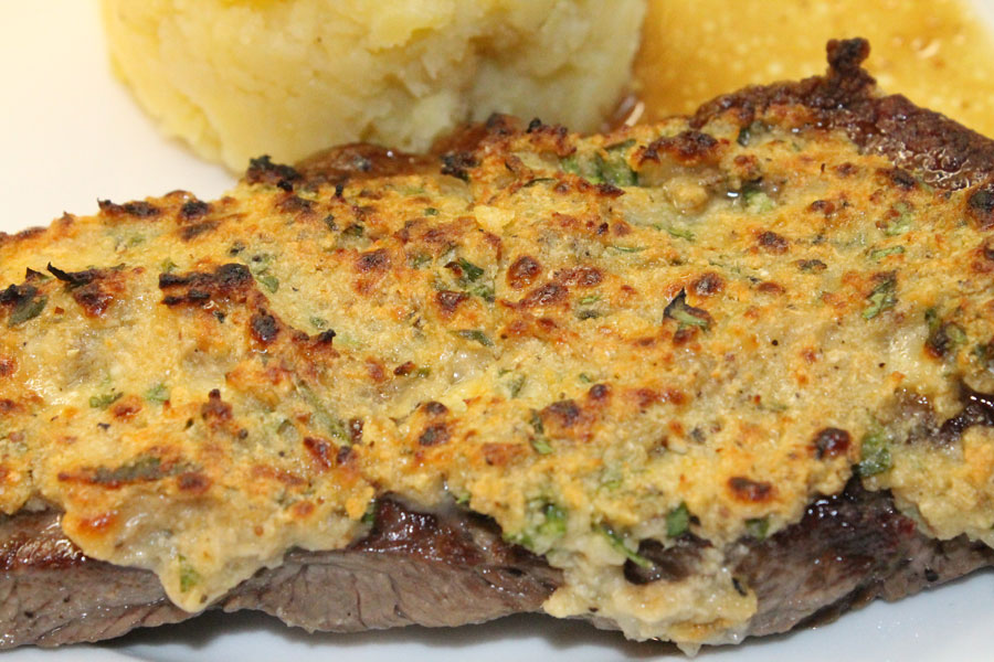 Die Rumpsteaks nach Art Strindberg mit Oliven-Kartoffelstampf oder Herzoginkartoffeln servieren.