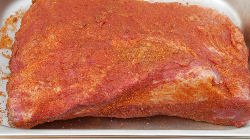 Zuerst muss die Rinderbrust pariert werden. Das bedeutet ich schneide den dicken Fettdeckel ab und befreie die Brust von Sehnen. Jetzt wird das Fleisch gewürzt. Ich verwende meinen Magic Dust Rub. Dieser Rub ist für mich der liebste und Beste und passt wirklich zu fast allen Fleischsorten welches man bei Niedrigtemperatur gart. Der Rub wird gleichmäßig auf der Rinderbrust verteilt und etwas einmassiert. Falls die Brust zu trocken ist und der Rub nicht haften bleibt, kann die Rinderbrust mit etwas Senf oder Olivenöl bestrichen werden.