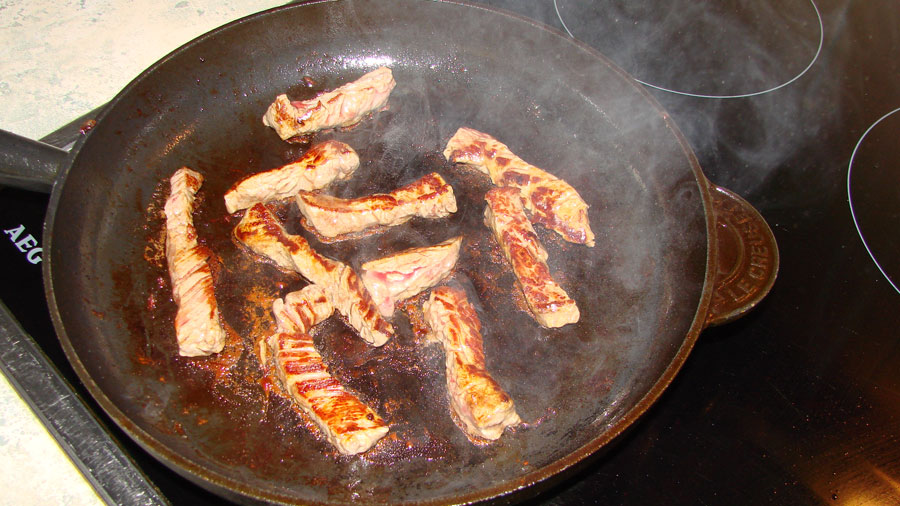 In einer gusseisernen Pfanne das Olivenöl erhitzen und die zimmerwarmen Rinderfiletstreifen portionsweise leicht bräunlich braten.