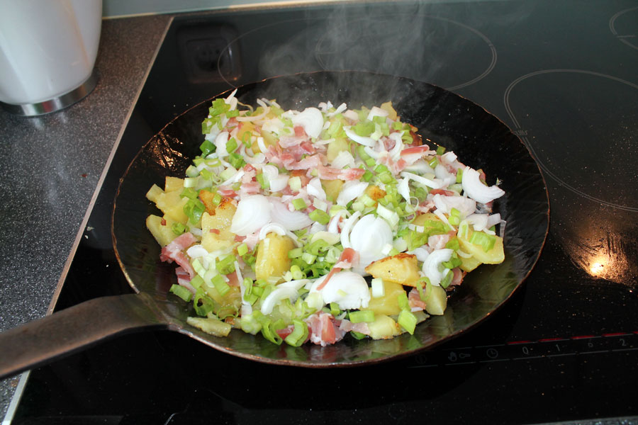 Bei den letzten Kartoffeln den Speck und die Frühlingszwiebeln dazugeben und kurz mit braten.