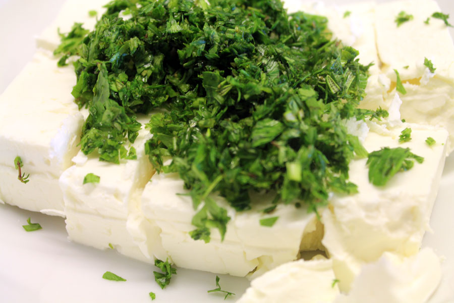 Die frischen Kräuter hacken, mit dem Feta Käse vermengen und mit Pfeffer abschmecken.