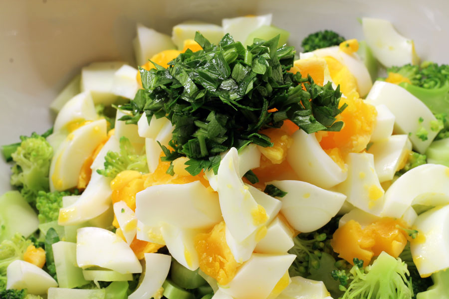 Die gekochten Eier unter kaltem Wasser abschrecken, schälen, in kleine Stücke schneiden und zum Brokkoli geben.