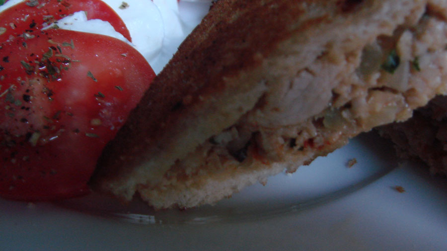 Die Pinienkerne in einer beschichteten Pfanne ohne Fettzugabe hellbraun rösten und auskühlen lassen. Die Zwiebeln schälen und in kleine Würfel schneiden. Die Champions mit einem Pinsel säubern und ebenfalls in Würfel schneiden. In einer Pfanne die Butter schmelzen und die Zwiebeln glasig dünsten und herausnehmen. In der gleichen Pfanne die gewürfelten Champions goldbraun braten. Alles auskühlen lassen. In einer Küchenmaschine die Schnitzel nicht zu fein zerhacken. Das Hackfleisch mit Salz, Paprikapulver, die Zwiebeln, die Champions, die Petersilie und die Thymianblättchen gut vermischen. Zum Schluss das Ei unterschlagen. 5 Scheiben Weißbrot mit der Hackmasse bestreichen, mit Chiliflocken bestreuen und die restlichen Scheiben darauflegen und leicht zusammendrücken. In einer Pfanne die Bruschetti von beiden Seiten goldbraun braten und im vorgeheizten Backofen bei 140°C ca. 10 Minuten auf dem Gitterrost fertig garen. Mit Tomate Mozzarella und Ruccola anrichten.