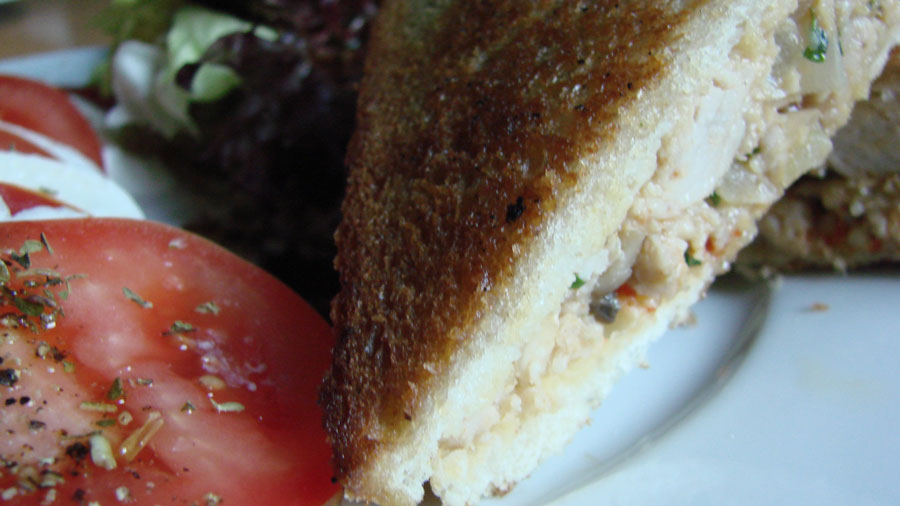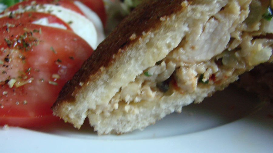 5 Scheiben Weißbrot mit der Hackmasse bestreichen, mit Chiliflocken bestreuen und die restlichen Scheiben darauflegen und leicht zusammendrücken.
