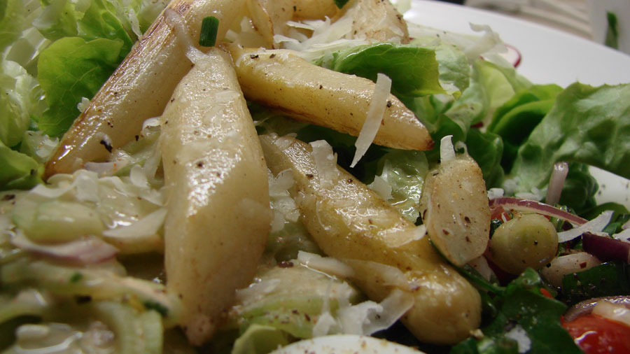 Den gebratenen Spargel über den Salat geben, mit Parmesanspäne und Schnittlauch bestreuen, mit frisch gemahlenem Pfeffer würzen und mit dem Dressing beträufeln.