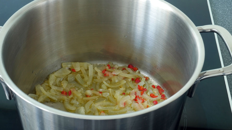 Etwas Butter in einem Topf schmelzen lassen und die Zwiebel und den Knoblauch glasig dünsten, danach die Chilischote dazugeben und kurz mit dünsten.
