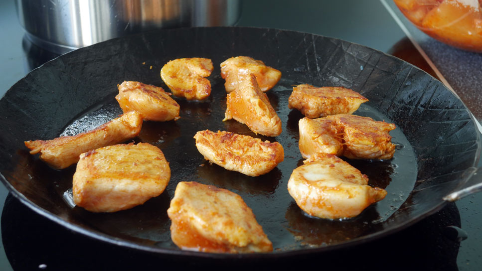 Mit der indischen Küche habe ich nicht sehr viel Erfahrungen, das heißt noch nicht oft gekocht, aber ich liebe indische Gewürze, wie Kreuzkümel, Kardamon, Ingwer, Koriander… Deshalb gehe auch mal gerne indisch essen. Und vor einiger Zeit habe ich dort ein leckeres Gericht gegessen, Butter Chicken. Heute war ich auf dem Markt und sah das Geflügelangebot, da fiel mir auf einmal dieses indische Chicken Gericht wieder ein. Da war doch noch was… wollte ich schon immer einmal selber kochen! Also kaufte ich drei Maishähnchenbrüste, mischte meine Gewürze zu Hause zusammen und es entstand mein eigenes Rezept für ein Butter-Chicken. Ist wahrscheinlich etwas entfernt vom Originalrezept, aber wir fanden es sehr lecker!