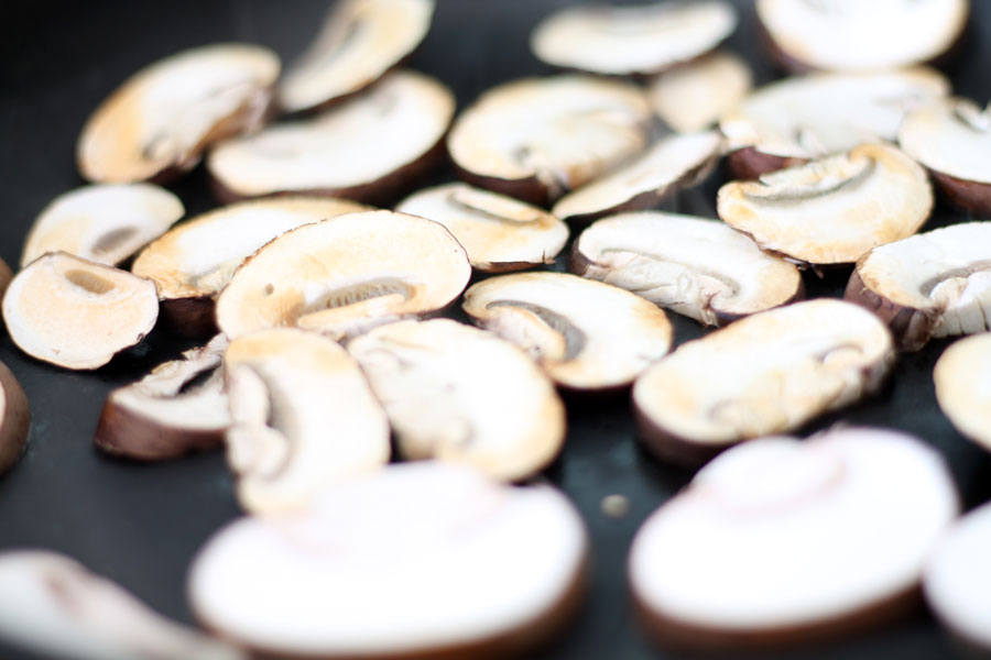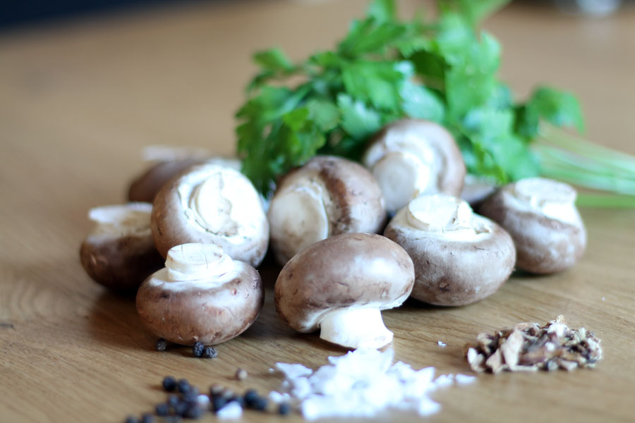 Die Champignons mit einem Pinsel säubern, das untere Ende des Stieles kurz abschneiden und in Scheiben schneiden.