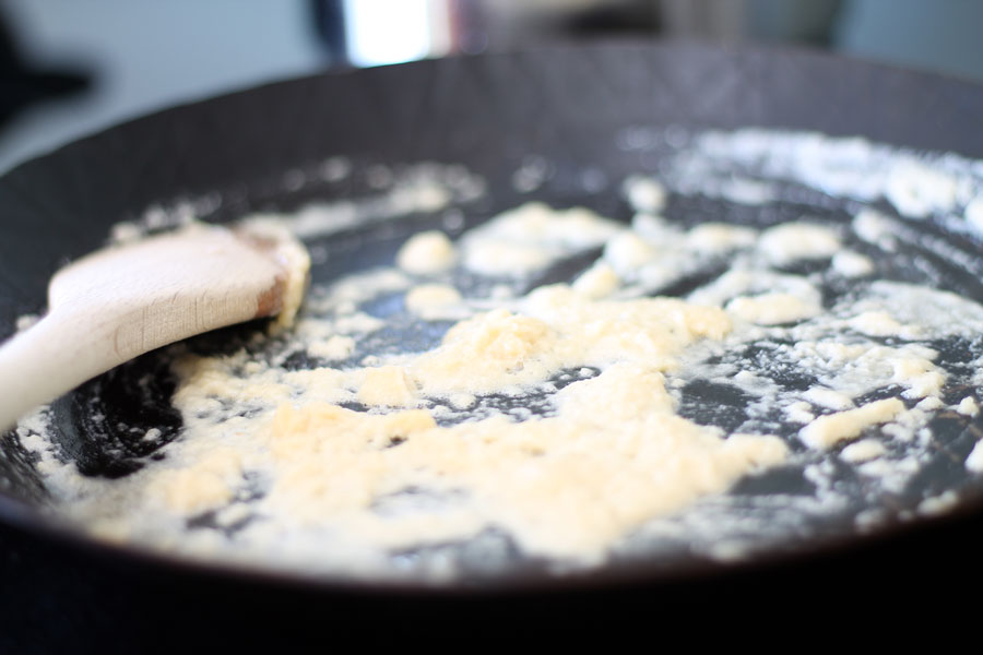 In der gleichen Pfanne die Butter schmelzen und das Mehl dazugeben und solange rühren bis es sich komplett mit dem Fett verbunden hat. Das Tomatenmark unterrühren.