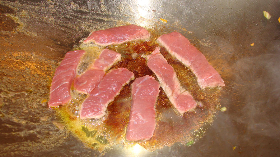 Nochmal etwas Öl in den Wok geben und die Rindfleischstreifen portionsweise kurz anbraten und aus dem Wok nehmen. Das Fleisch salzen.
