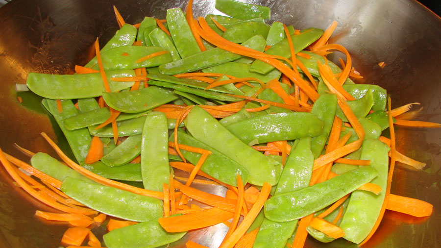 Danach die Mohrrübenstreifen und die Zuckerschoten anbraten und ebenfalls aus dem Wok nehmen.
