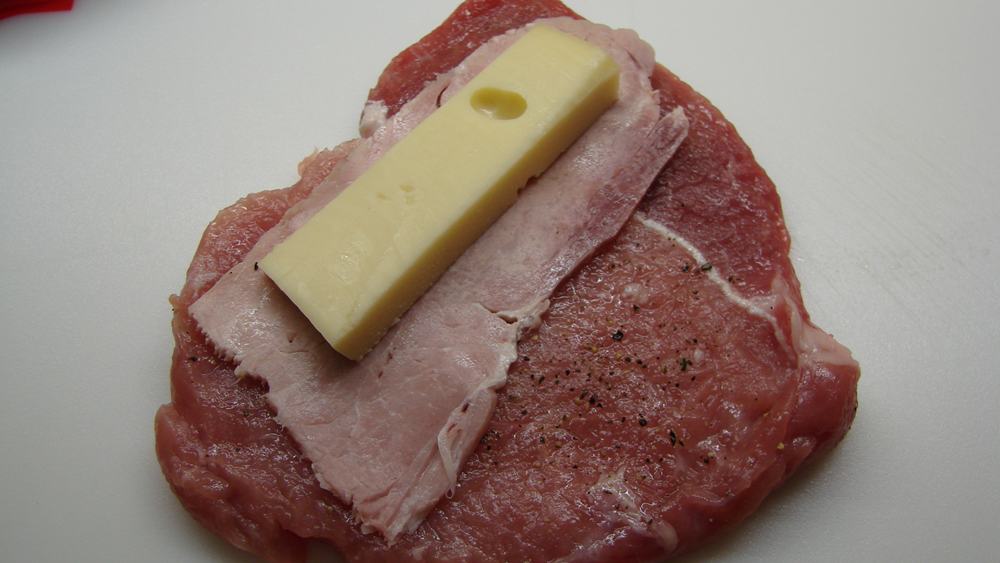 Auf die Schnitzel eine Scheibe Kochschinken legen und dann eine Scheibe Käse darauflegen.