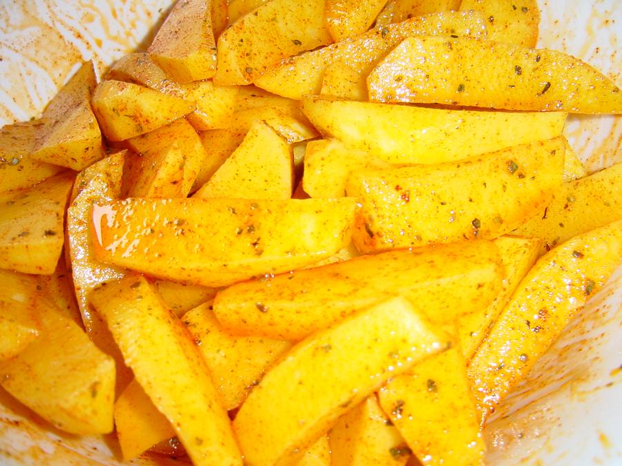 Die Kartoffelspalten dazugeben und alles solange mischen bis die Kartoffelspalten völlig vom gewürzten Öl überzogen sind.