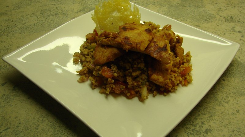 Couscous Salat mit Putenstreifen und Parmesanhippe