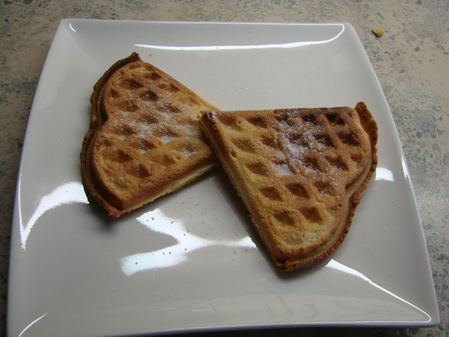 In einem Waffeleisen nach Gebrauchsanleitung Waffeln backen. Die Menge ergibt ca. 6 Waffeln.