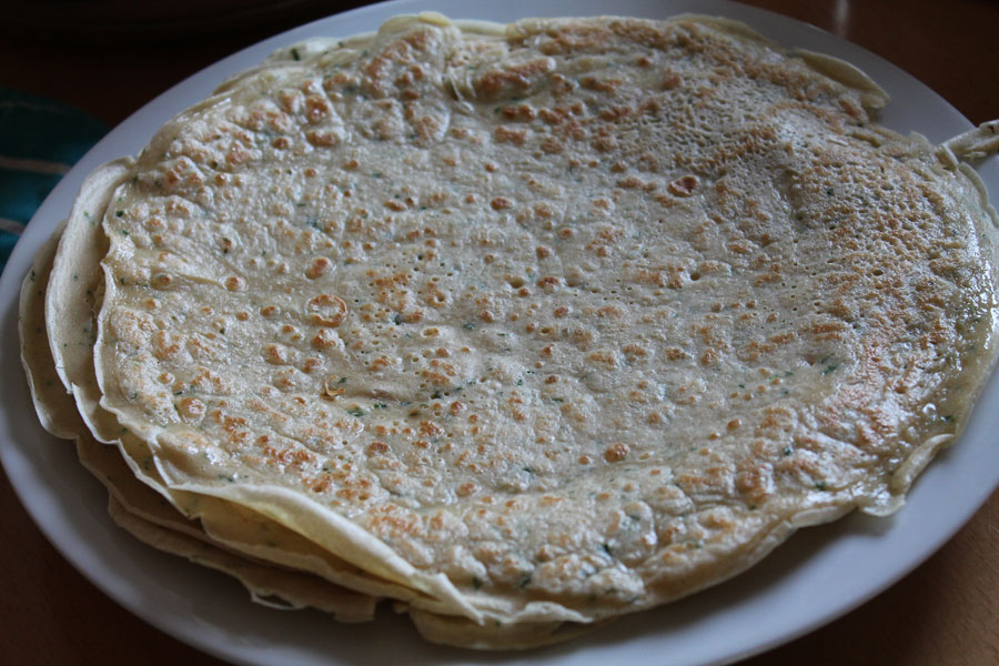 Eine beschichtete Pfanne bei mittlerer Temperatur erwärmen und mit einer Schöpfkelle ein wenig von dem Teig hineingießen und die Pfanne schwenken so dass ein runder dünner Crepe entsteht.