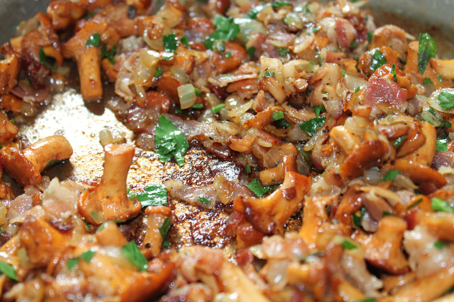 Die Butter erhitzen, den Bacon und die Zwiebelwürfel darin anbraten und bei hoher Temperatur die Pfifferlinge dazugeben und unter Schwenken ca. 3-5 Minuten braten.