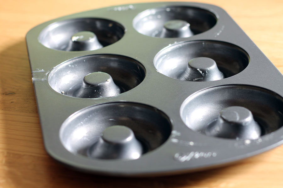 Die Donuts Backform etwas einfetten, ca. 2/3 mit dem Teig füllen und im vorgeheizten Backofen bei 220 Grad 10 Minuten backen.