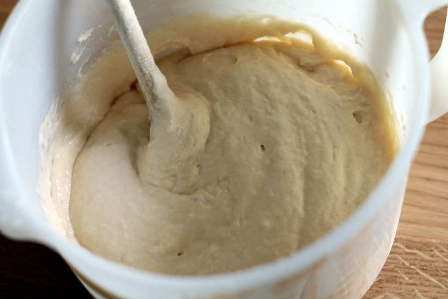Nun die trockenen Zutaten nach und nach unter die Ei-Mischung rühren bis ein glatter geschmeidiger Teig entsteht.