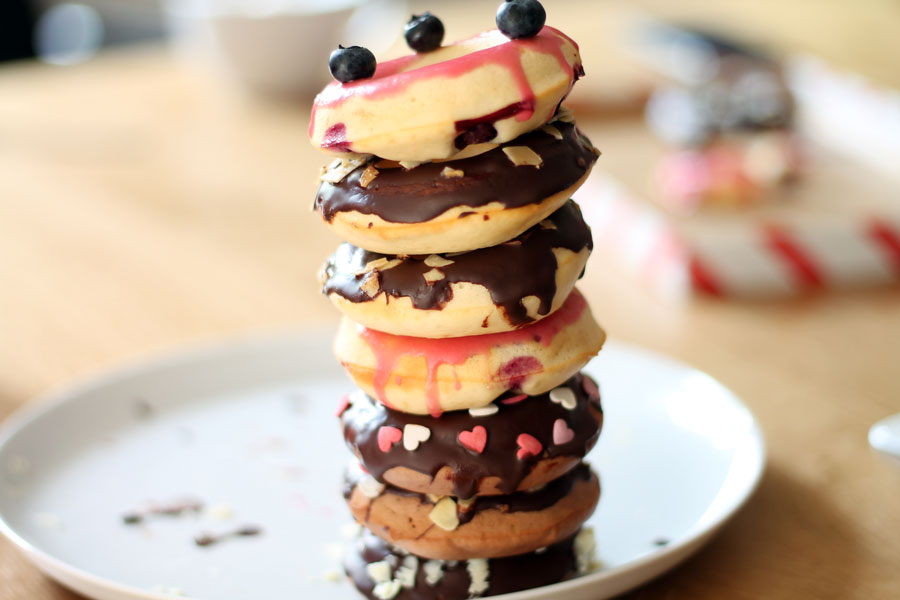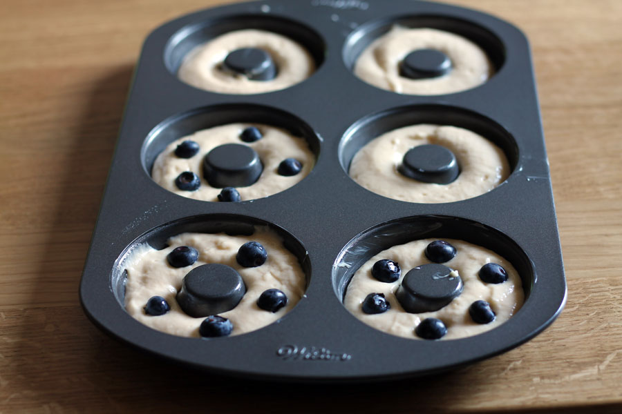 Ich habe in drei Donuts ein paar Heidelbeeren gedrückt und so bekamen diese noch eine fruchtige Note.