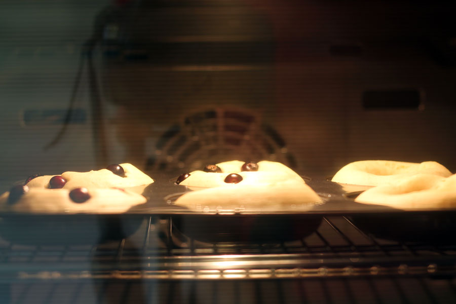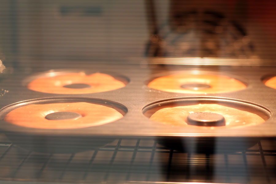 Tipp: Wer sicher gehen will macht den Drucktest. Einfach mit dem Finger ein wenig auf das Gebäck drücken, entsteht keine Delle sondern der Teig springt zurück in die Ausgangsform können die Donuts aus dem Ofen genommen werden.