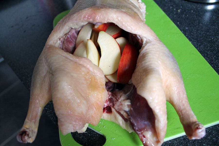 Ich habe die Enten zuerst gut von innen und außen mit kaltem Wasser abgespült und dann mit Küchenpapier trocken getupft.