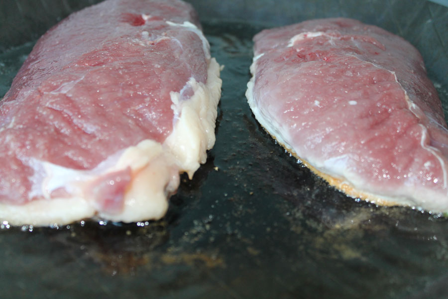 Tipp: Am besten mit einem Cuttermesser oder Skalpell einritzen. Vorsichtig sein und nicht das Fleisch mit einritzen. So kann das Fett der Haut besser austreten und die Haut wird schön knusprig.
