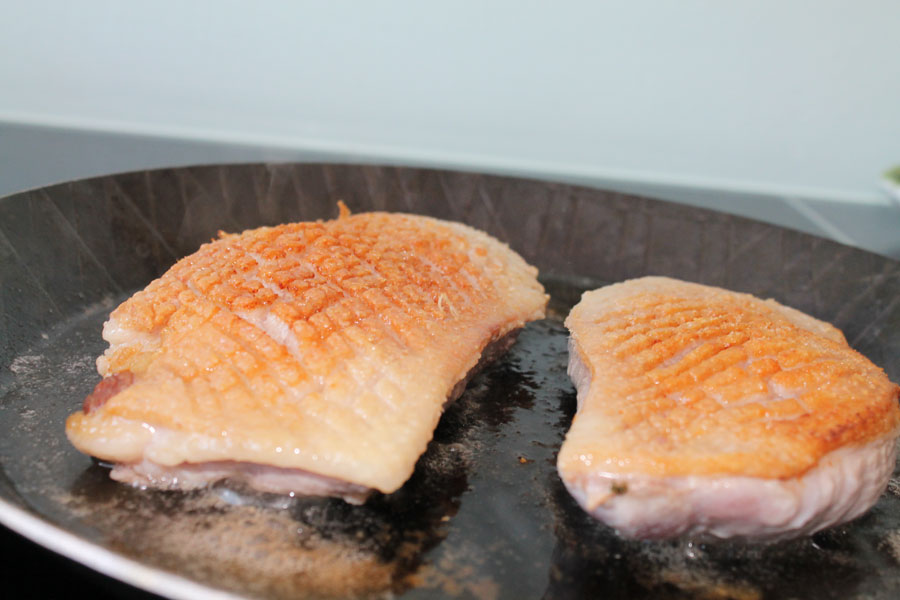 Die Entenbrustfilets wenden und auf der Fleischseite anbraten.