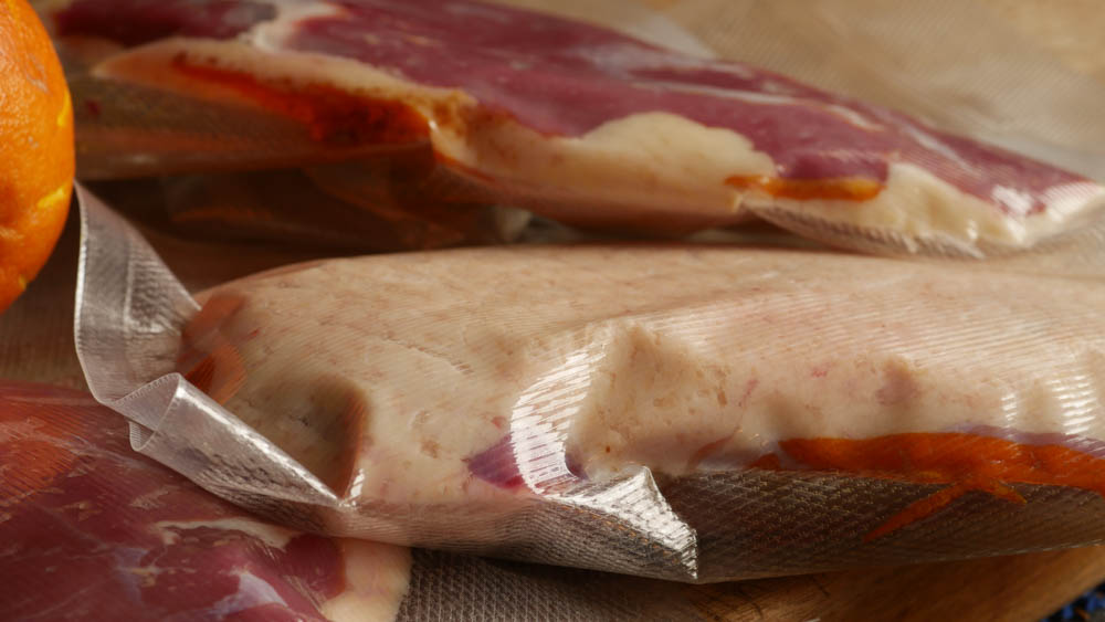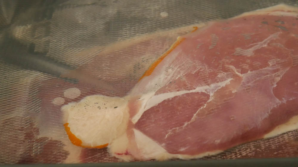 Die Entenbrust mit einer Orangenzeste in den Vakuumierbeutel einlegen und mit einem Vakuumierer luftdicht verschließen.