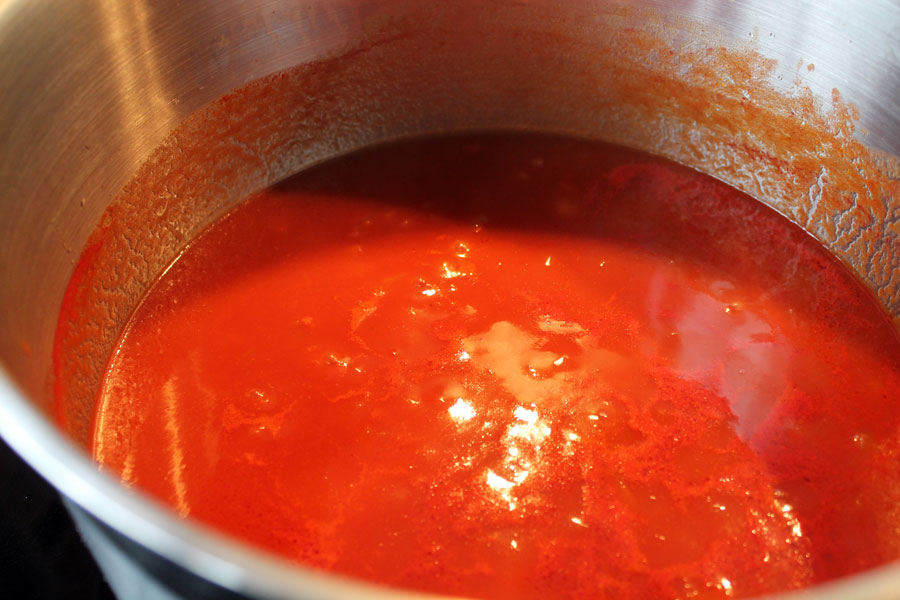 Die passierten Tomaten dazugeben und mit Salz und Zucker würzen.