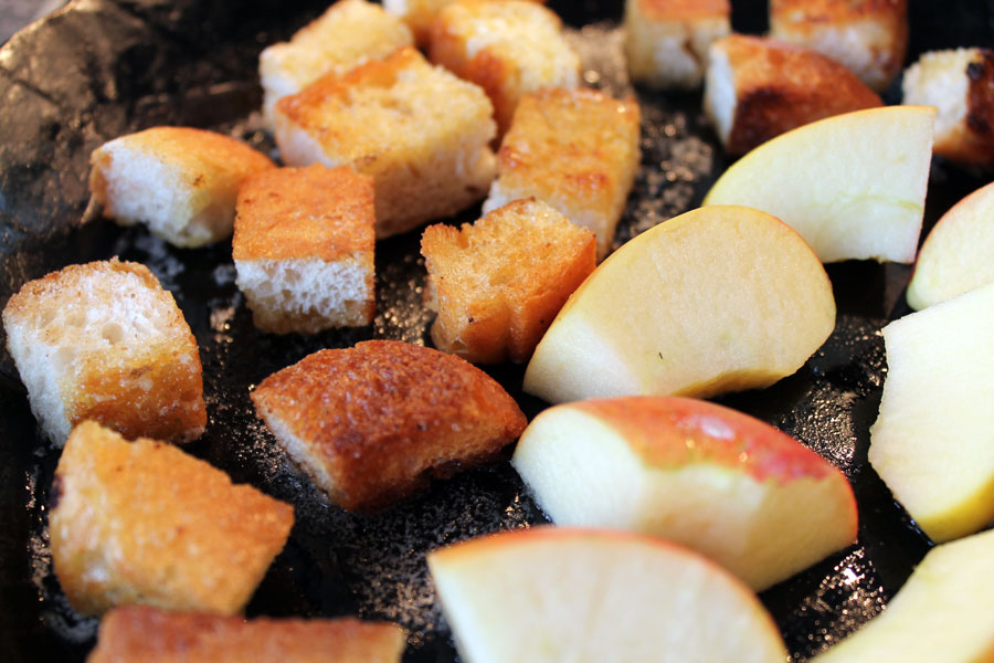 Ich habe meine Suppe dann mit Kokosraspeln garniert und Ciabatta-Apfel-Spieße serviert.