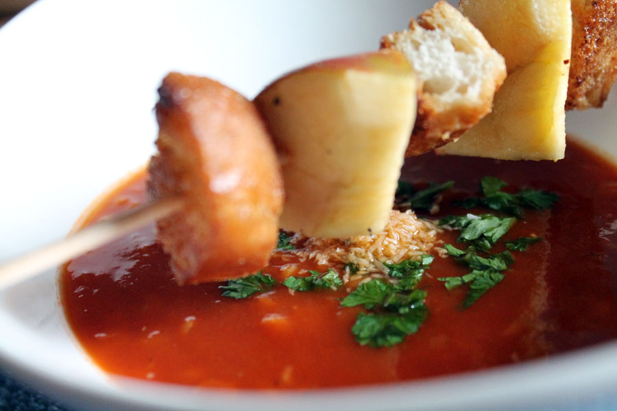 Die Suppe mit Kokosraspeln garnieren und mit Ciabatta-Apfel-Spießen servieren.