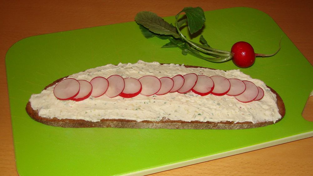 Auf frischem dunklem Brot servieren, belegt mit dünnen Gewürzgurkenscheiben oder Radieschenscheiben.