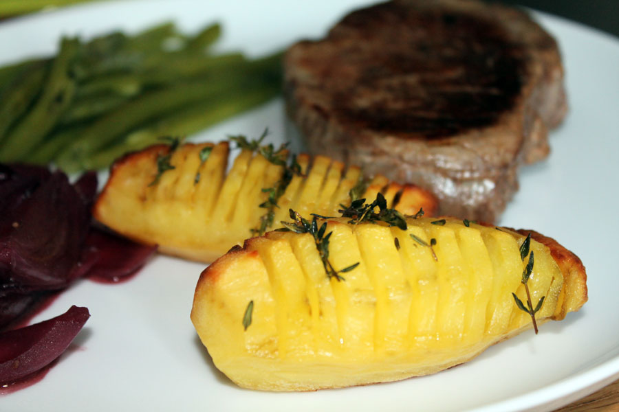 Fächerkartoffeln sind eine sehr schöne dekorative Beilage. Man sollte nicht zu große und möglichst gleich große Kartoffeln wählen, denn so garen sie gleichmäßig. Bei zu großen Kartoffeln kann es passieren, dass sie im Kern noch nicht gar sind, aber die Oberfläche schon zu dunkel ist. Zu rohe und verbrannte Kartoffeln schmecken einfach nicht.