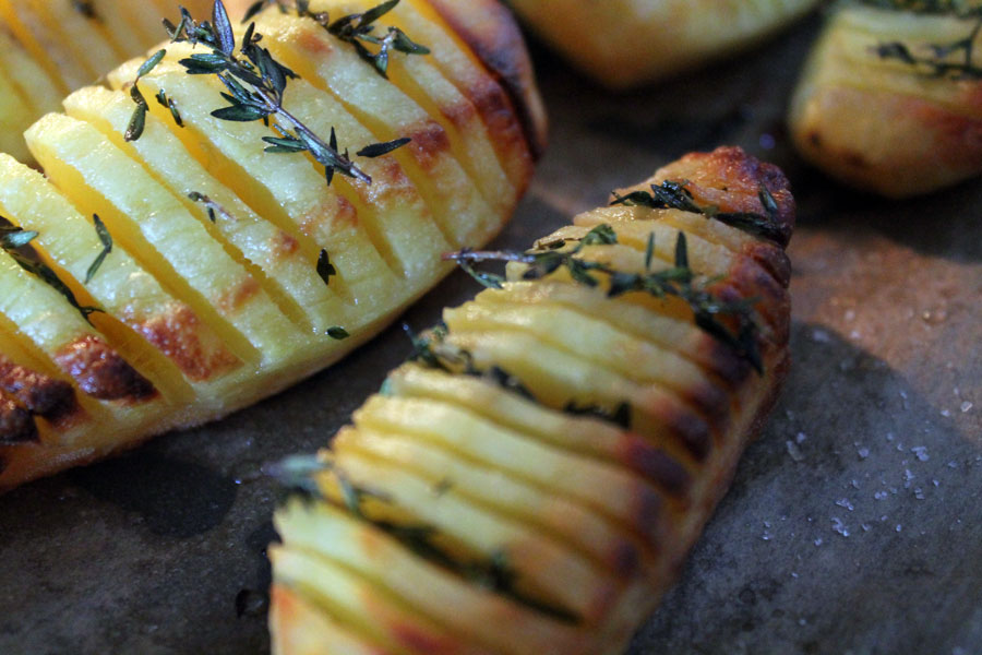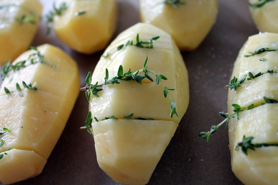 In ein paar Fächern der Kartoffeln kleine Thymianzweige stecken.