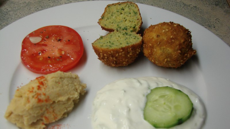 Wie auf dem Bild zu sehen ist, habe ich diese Falafel mit Hummus und Tzaziki serviert.