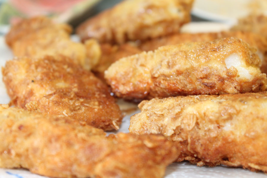 Die gebratenen Fischstäbchen aus der Pfanne nehmen und kurz auf Küchenpapier abtropfen lassen.