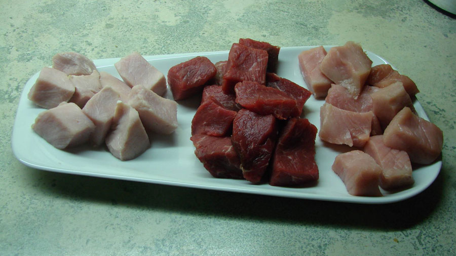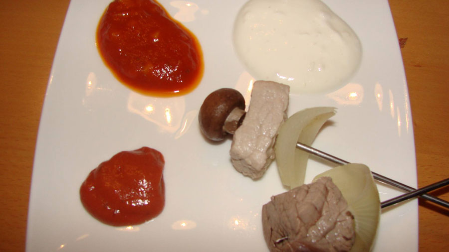 Für das Fondue eignen sich Rinderfilet, Schweinefilet, Kassler und Hähnchenbrust.