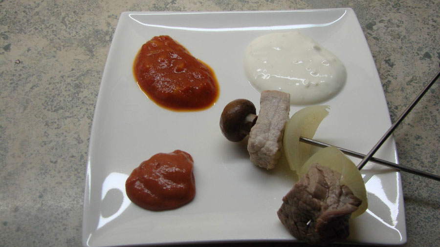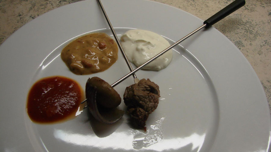 Auch Champions und Zwiebeln haben wir auf Fonduegabeln gesteckt und gegart. Die leckeren Saucen passten perfekt zum Fondue.