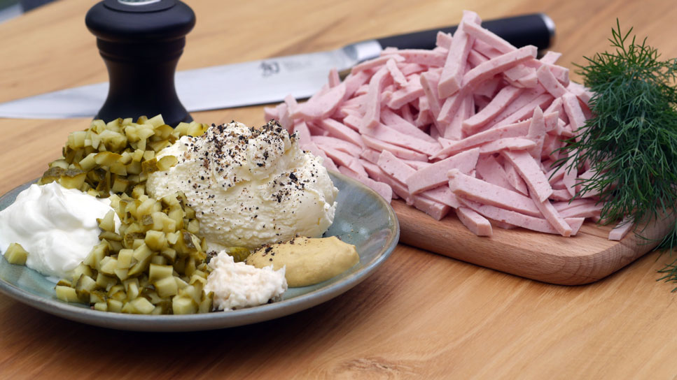 Für die Sauce den Frischkäse, Joghurt, Senf, Meerrettich, etwas Essig, ein wenig Zucker verrühren und zu den Lyoner Streifen geben.