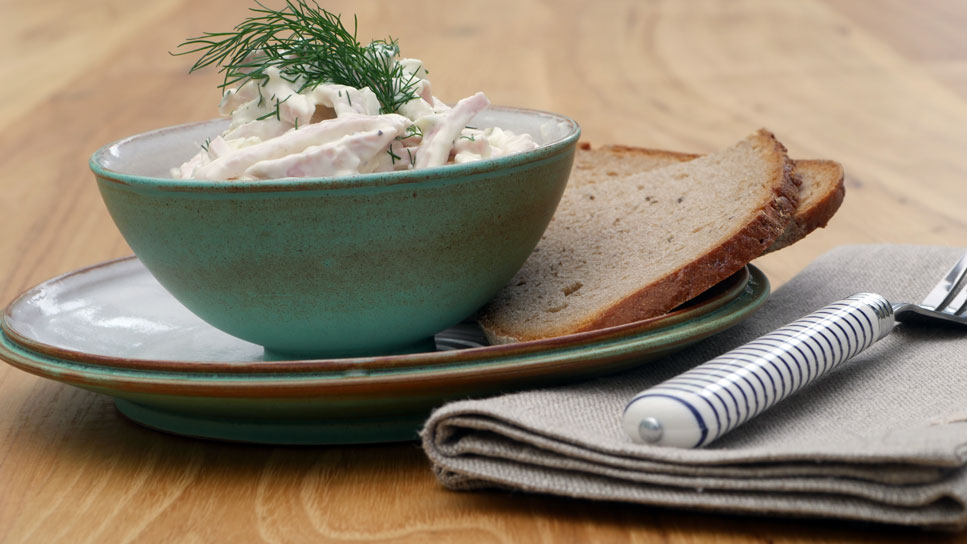 Zum Schluss etwas frisch geschnittenen Dill unterheben und der Fleischsalat ist fertig.
