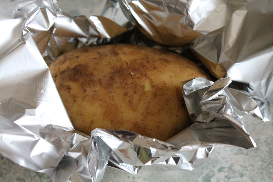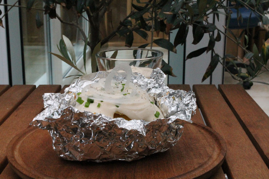 Wenn die Kartoffeln gar sind die Folie öffnen und die Kartoffel kreuzweise einschneiden und etwas auseinander drücken.