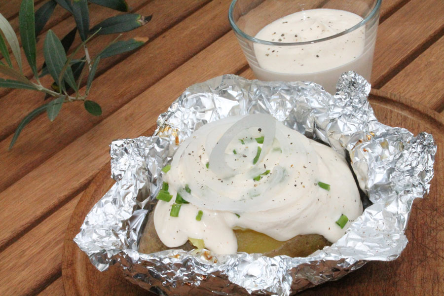 Dann den Dip, Schnittlauch, frisch gemahlenen Pfeffer auf die Kartoffel geben und servieren.