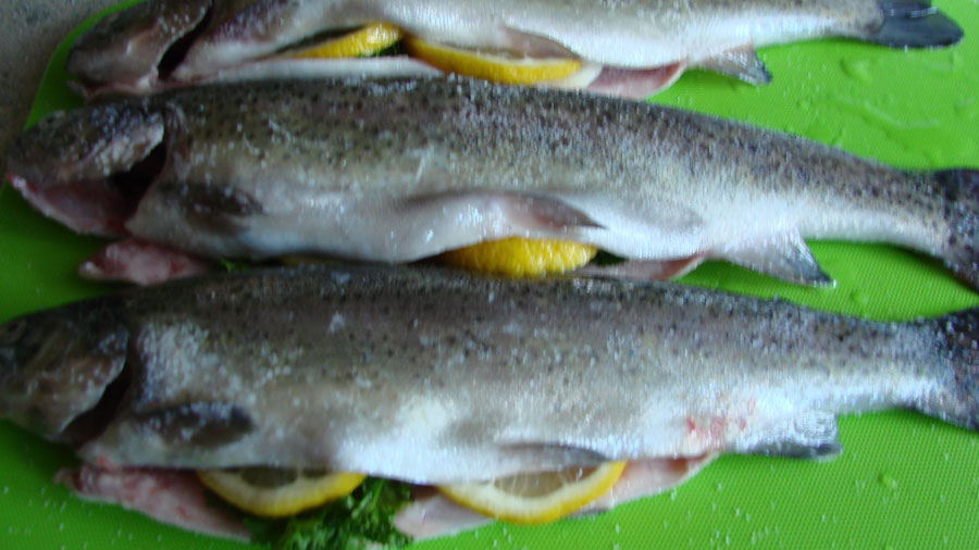 Die Forellen auf ein Brett legen, auf beiden Seiten an der jeweils dicksten Stelle 3-4 mal schräg von Kopf in Richtung Schwanz leicht einschneiden.