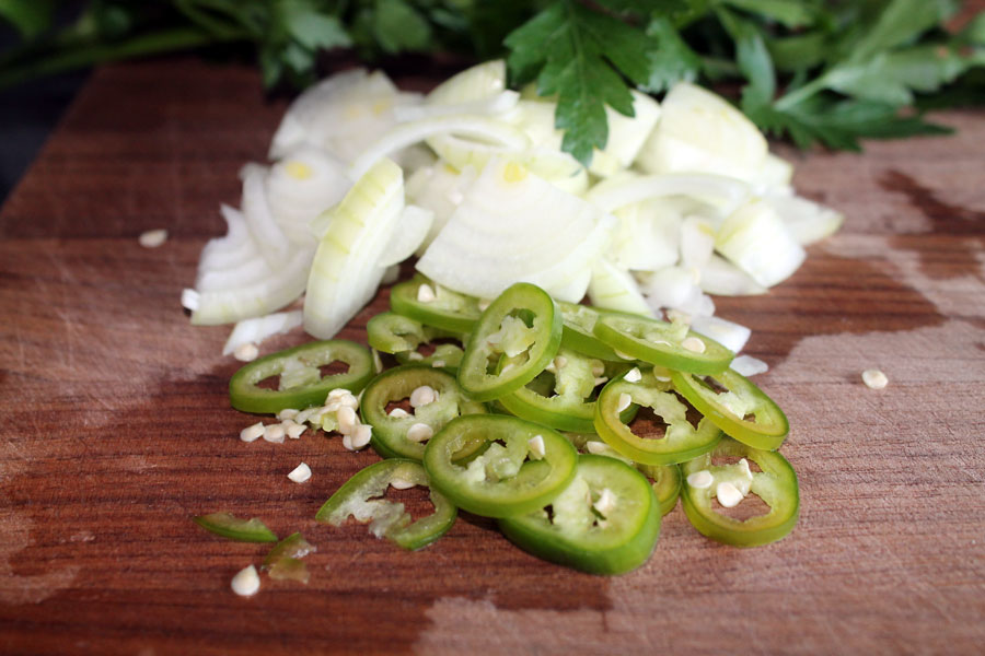 Zuerst die Zwiebel schälen, vierteln und in dünne Ringe schneiden. Die Chilischote säubern, den Stiel abschneiden und dann in dünne Ringe schneiden.