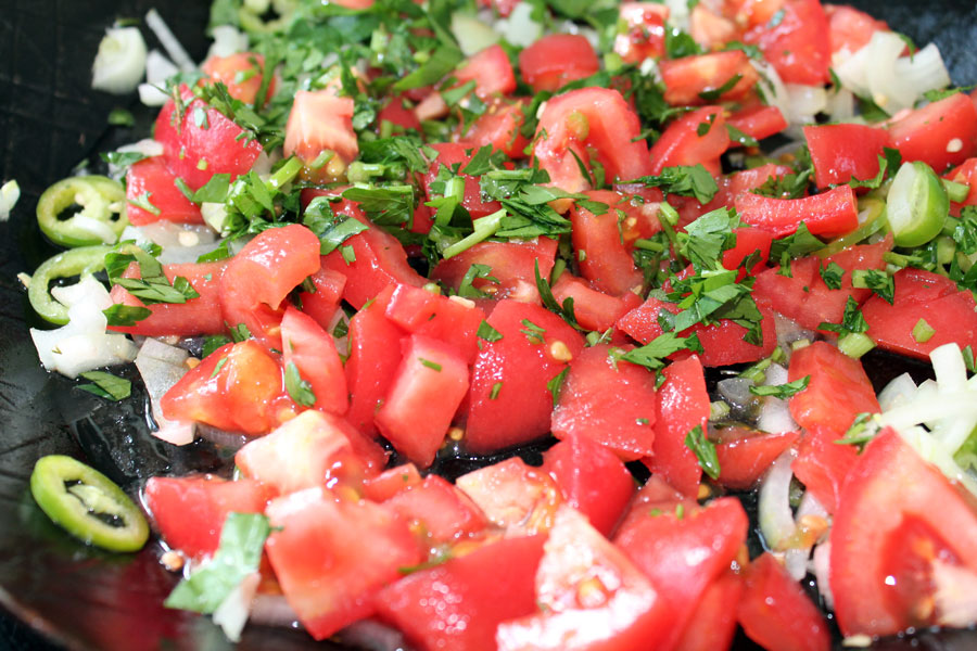 Etwas Olivenöl in einer Pfanne erhitzen, zuerst die Zwiebel glasig dünsten, dann die Chilischote, die Tomatenwürfel und die Kräuter dazugeben, kurz mitdünsten, dann alles aus der Pfanne nehmen und beiseite stellen.
